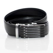 Superior metallic line detailing and a silver and black contrasting color design combine to create a powerful, solid look in this modern styled adjustable belt buckle.