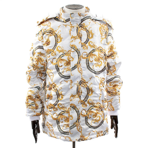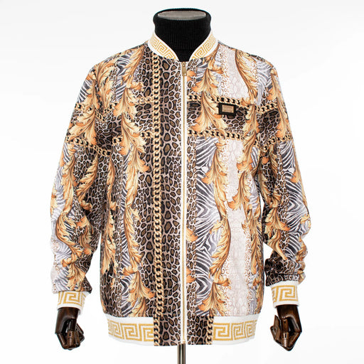 This modern styled polyblend jacket features a designer Grecian medallion motif and a smooth fitting zip-closure that makes it a crisp, easy to wea...