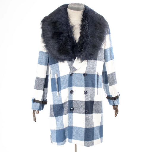 Navy Plaid Double-Breasted Overcoat With Fur Collar