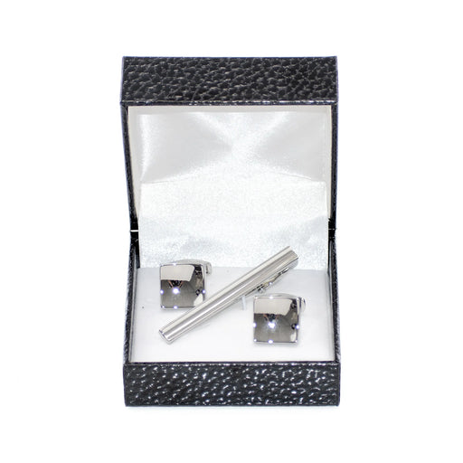 Silver Concaved Square Cufflink Tie-Bar Set