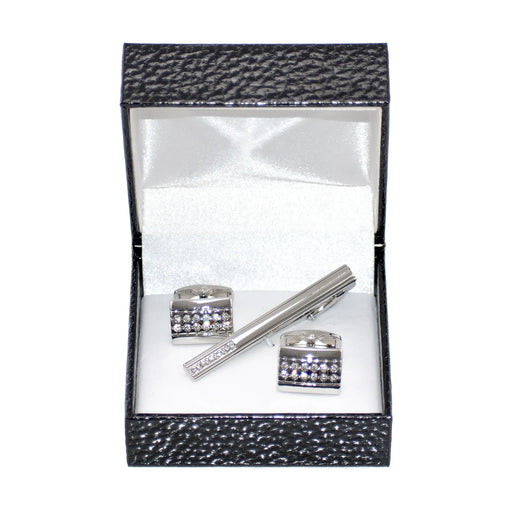 Silver Modernist Crystal Cufflink Tie-Bar Set