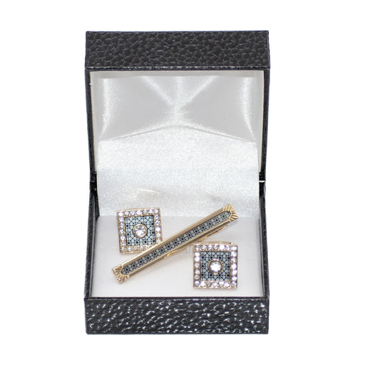 Raised Square Rhinestone Encrusted Cufflink Tie-Bar Set