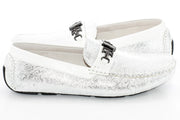 Hypnotic line detailing creates an eye catching motif in this slick driver loafer with a segmented sole and designer strap-bit of embedded crystal and polished gunmetal.