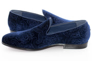 A minimalist design and sleek contours highlight this loafer's fine embroidered damask and patent-black outsole, creating a graceful accent to tuxedos or formal jackets.