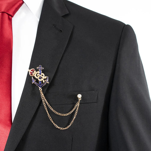 Chart your own course with this stylish ship's wheel lapel pin. Featuring a designer gold chain and anchor motif.