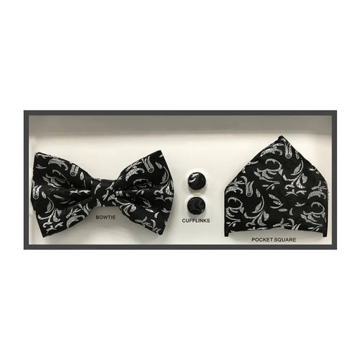 This bow-tie features a pleasing floral exterior complimented by a vintage, refined style. Includes matching pocket-square and cufflinks.
