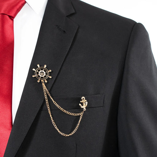 Chart your own course with this stylish ship's wheel lapel pin. Featuring a designer gold chain and anchor motif.