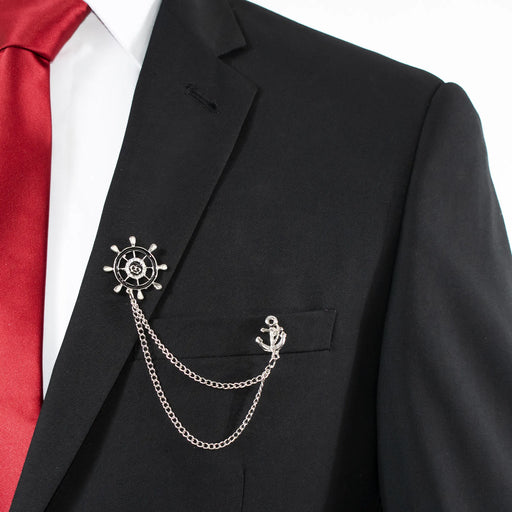 Chart your own course with this stylish ship's wheel lapel pin. Featuring a designer silver chain and anchor motif.