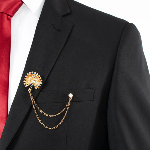 Stand out with this handsomely styled pin featuring a peacock motif of rich color and embedded crystal that's easily paired with a variety of suits.