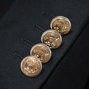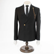 This dignified suit features handsome peak lapels and a unique, offset single-breasted closure that makes it a suave, sleek option for office wear or formal events.
