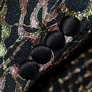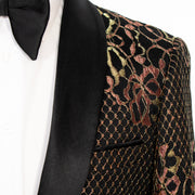 Shawl lapels accent an intricate lace floral pattern and contrast colors in this stylish dinner jacket tailored from stretch fabric for comfort during weddings.