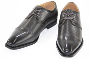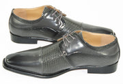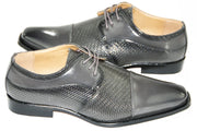 An exotic lizard-skin vamp adds dynamic texture to this handsomely styled dress shoe featuring a derby lace and cap-toe design that can be worn to accent a tuxedo or a formal suit.