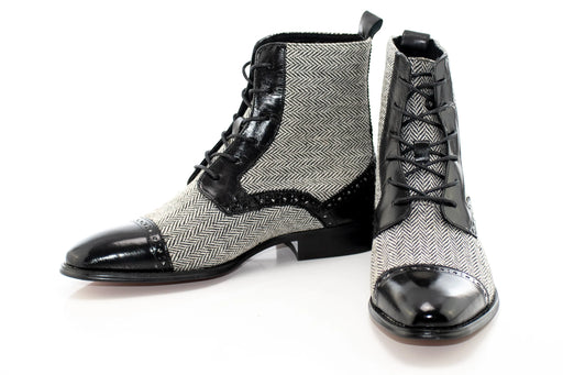 A classy cap-toe combines gracefully with a handsome herringbone tweed with black leather trim to create a boot with a unique look. A tough, leath...