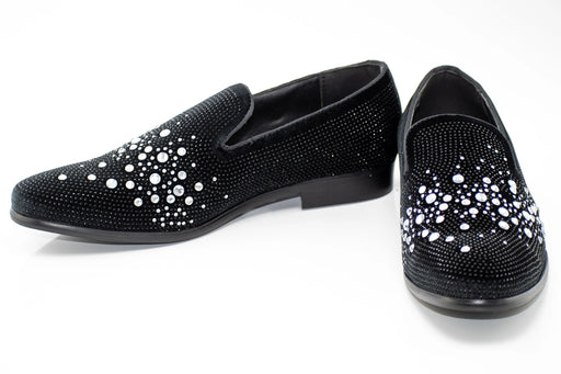 Eye-catching studs lend a luxurious shine to this attractive slip-on dress loafer with a slim, subtle profile that pairs great with a black-tie tux...