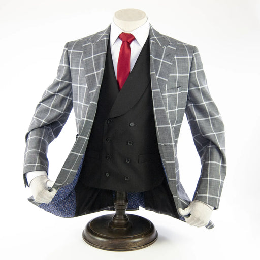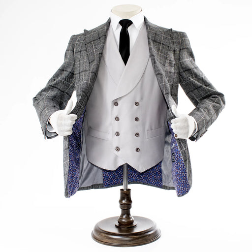 Handsome plaid and a soft gray coloring create a sophisticated, office-ready look in this refined three-piece suit with a double-breasted vest and ...