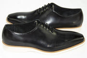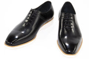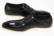 Stand out while still maintaining a professional appearance in this classy lace-up featuring a patent black exterior and Oxford style closure atop a handsome welt-stitch and colorful outsole.