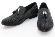 Lustrous sequin and rhinestones tastefully accent the solid black upper of this attractive dress loafer featuring a chic red sole and metal bit tassels.