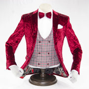 This two-buttoned tuxedo with its velour feel is perfect as a party suit or a prom suit.  Vest, Pants and Bow Tie come in a contrast white, red and black plaid pattern to make you really stand out at any event.