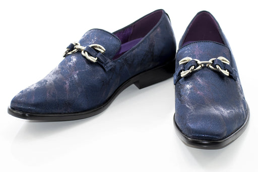 A sophisticated chrome bit accents the elegance of a handsome smoking loafer styled with a designer textured upper sat atop a classy black outsole....