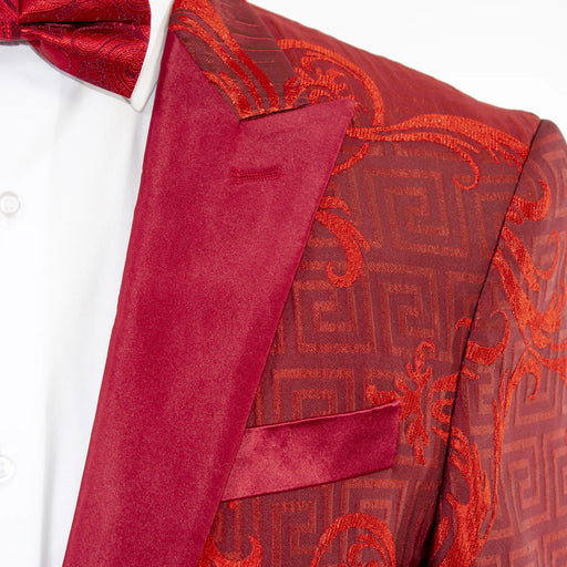 Passionate red coloring enhances the elegant styling of this attractive slim-fit jacket featuring peak lapels and a showy Grecian motif for a touch...