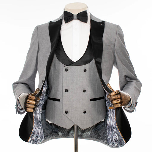 Uniquely styled western damask embroidery accents this tuxedo's debonair attitude and large, ornate buttons, creating a bold, distinct look that st...