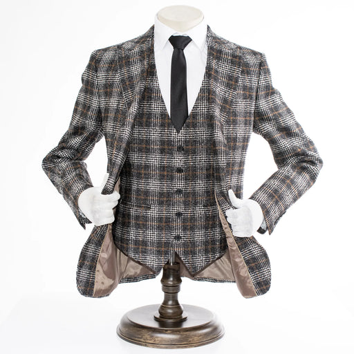 Handsome plaid and a soft gray coloring create a sophisticated, office-ready look in this refined three-piece suit with a double-breasted vest and ...