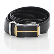 A stylish, gold elongated 'H' motif anchors the minimalist design styling of this belt buckle for a look that's powerful yet sleek.