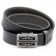Strong curves and deeply engraved lines define this elegant yet powerfully styled adjustable belt buckle.