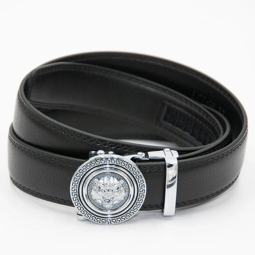 Dual Grecian inlays encircle a finely detailed tigerhead motif in this striking adjustable belt buckle. Features: 100% Pure Leather Fully Adjustab...