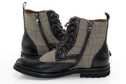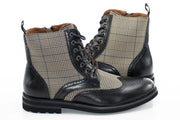 Handsome plaid and a fine wingtip brogue combine to create a dapper exterior for this designer boot featuring a quarter zipper and lace-up design perfect for a business or semi-casual look.