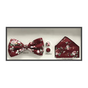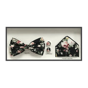 This bow-tie is decorated by a pleasant blooming flower motif set on a solid black exterior. Features matching pocket square and cufflinks.