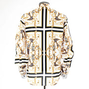 Featuring a contrasting color design of white and black complimented by a chic leopard skin motif, this dress shirt's stark lines and gold damask styling combine for a clean, regal look. Match it with a formal jacket or suit for a very suave look during a night out.