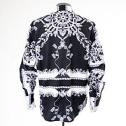 Highlighted by an intricate floral motif, this dress shirt's detailing and stark exterior design featuring embedded rhinestone create a bold style with added elegant flair. Pair it with a suave jacket or suit for a great date-night or clubbing option.