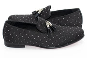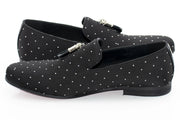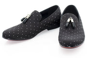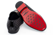 A classy embellishment of faux-diamond adorns a tasseled loafer grounded by an elegant red sole.