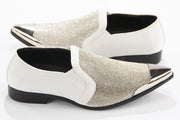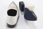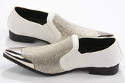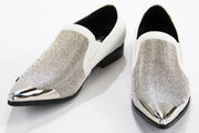 White Velvet & Silver Rhinestone Smoking Loafers With Metal Tip