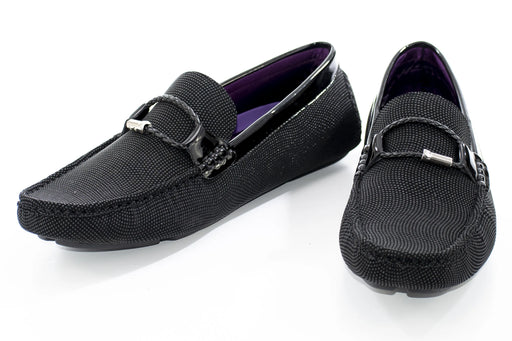 An eye-catching diamond textured upper creates a lush look to this handsome slip-on bit-loafer featuring a patent black outsole for succulent styli...