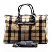Khaki Plaid and Black Leather Travel Bag