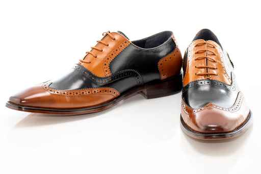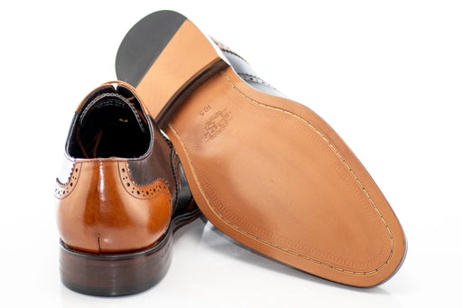 This fashionable two-tone Oxford wingtip lace-up dress shoe with its unique tan and black color blocking lends itself well to any formal attire. P...