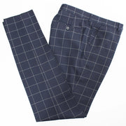 Enticing wide-check plaid creates a subtle impression on a classy tailored-fit suit featuring an attractive navy-blue coloring and peak lapels for added flair.