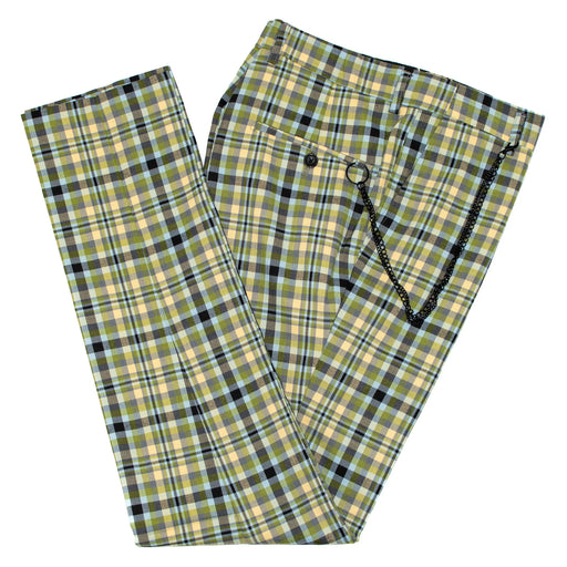 A black metal chain adds signature class to these versatile dress pants tailored with an easy fit and trendy plaid for vintage style.