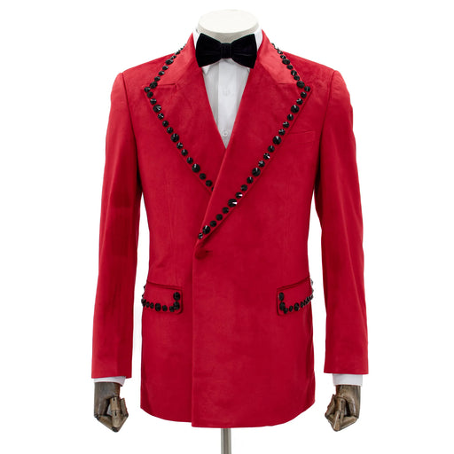 Red Velvet Modern-Fit Tuxedo Jacket with Large Black Rhinestones