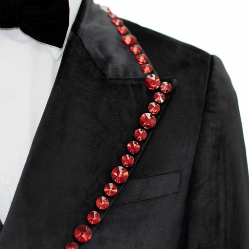 Black Velvet Modern-Fit Tuxedo Jacket with Large Red Rhinestones